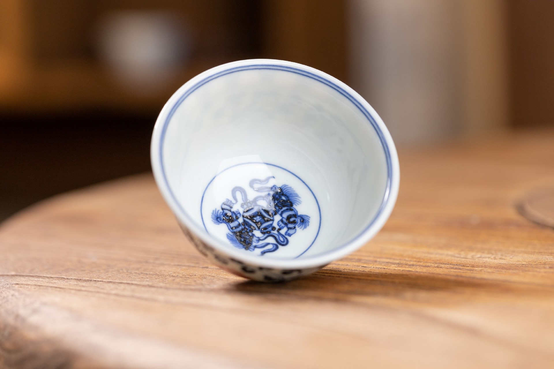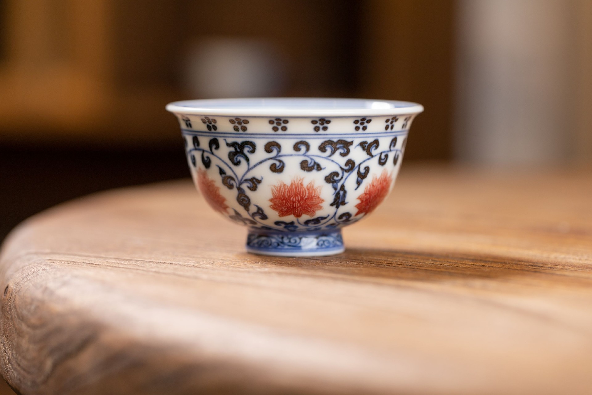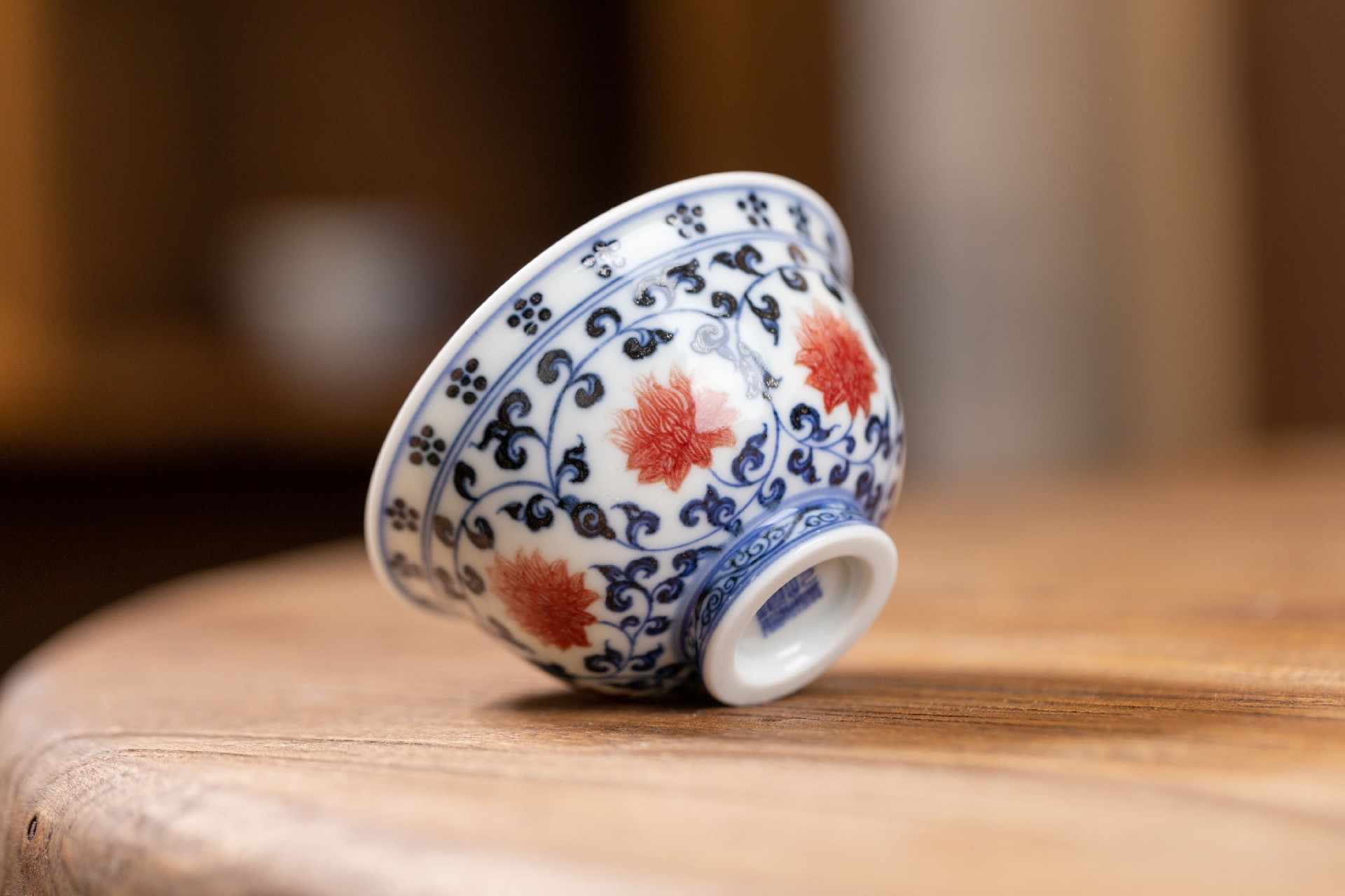 屹朴青花釉里红缠枝莲小压手狮心内绘