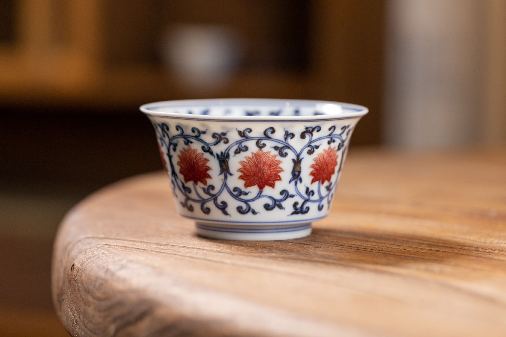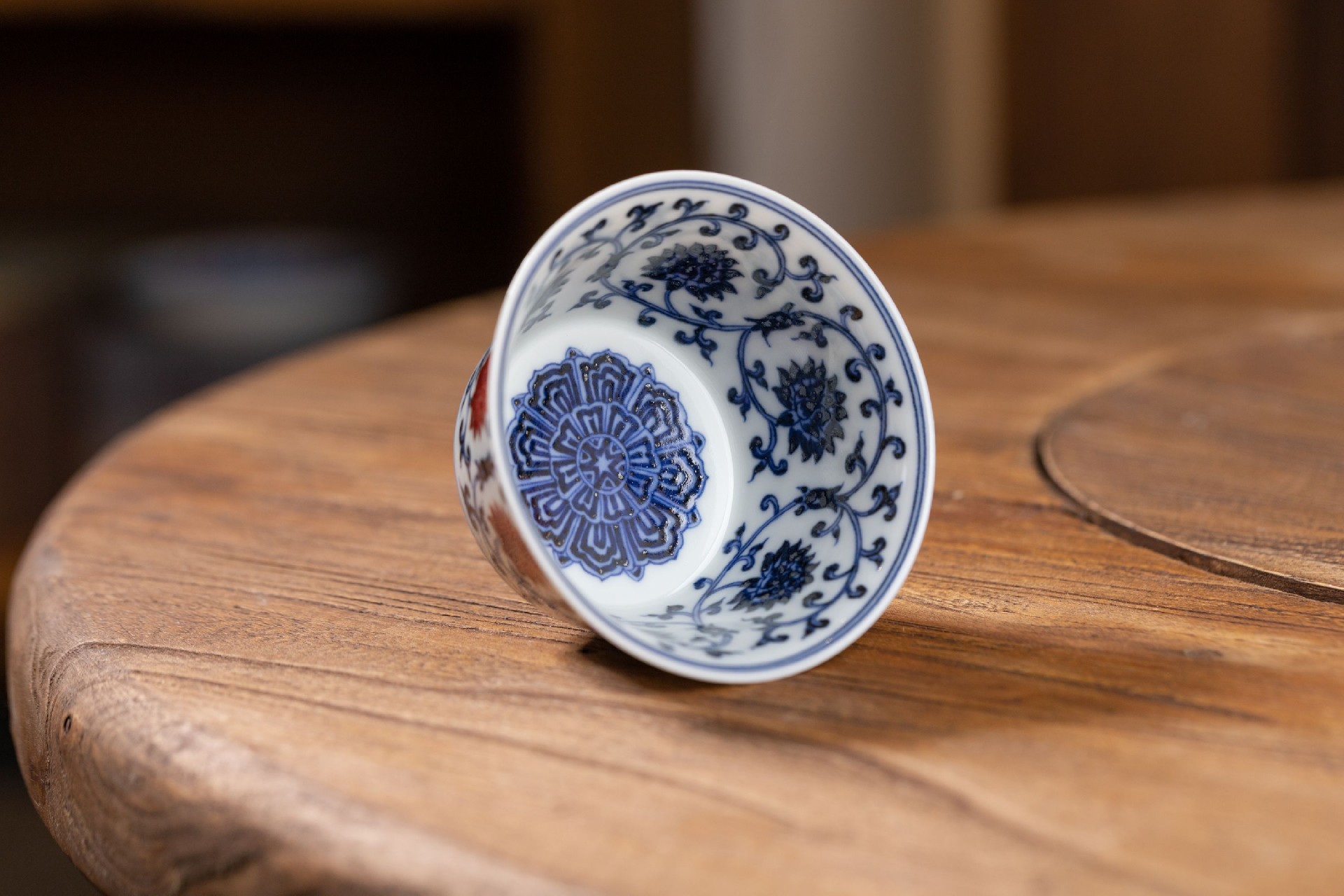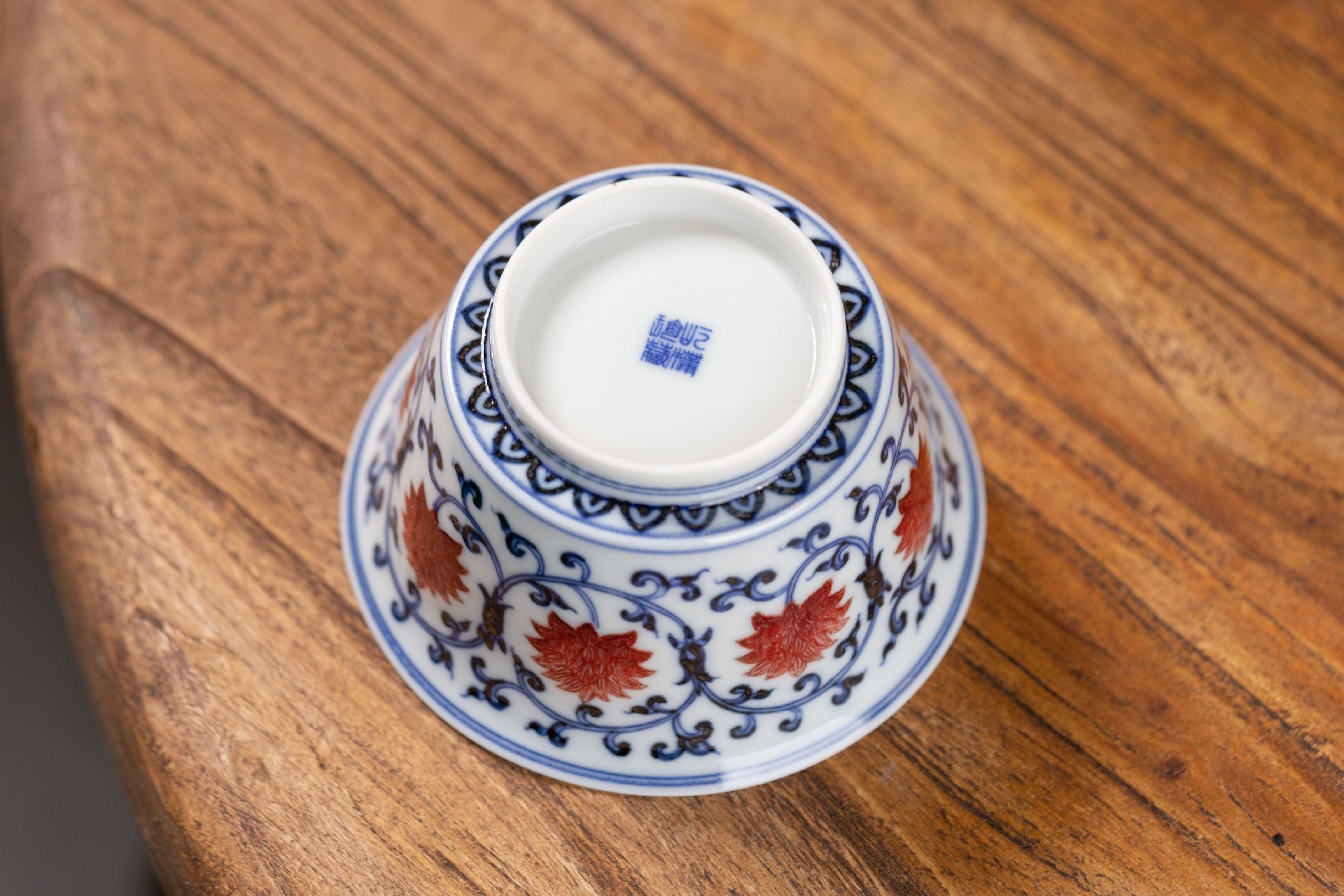 屹朴青花釉里红缠枝莲内外满绘马蹄杯